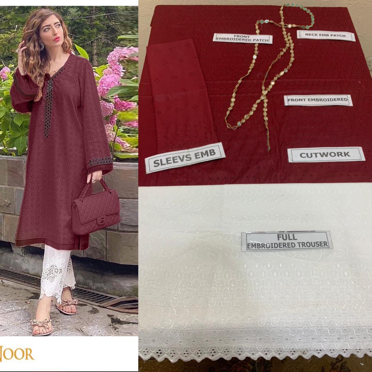 Agha Noor fully chikenkari base shirt with neck and sleeves mirror lace and with embroided chikenkari trouser 2pc suit