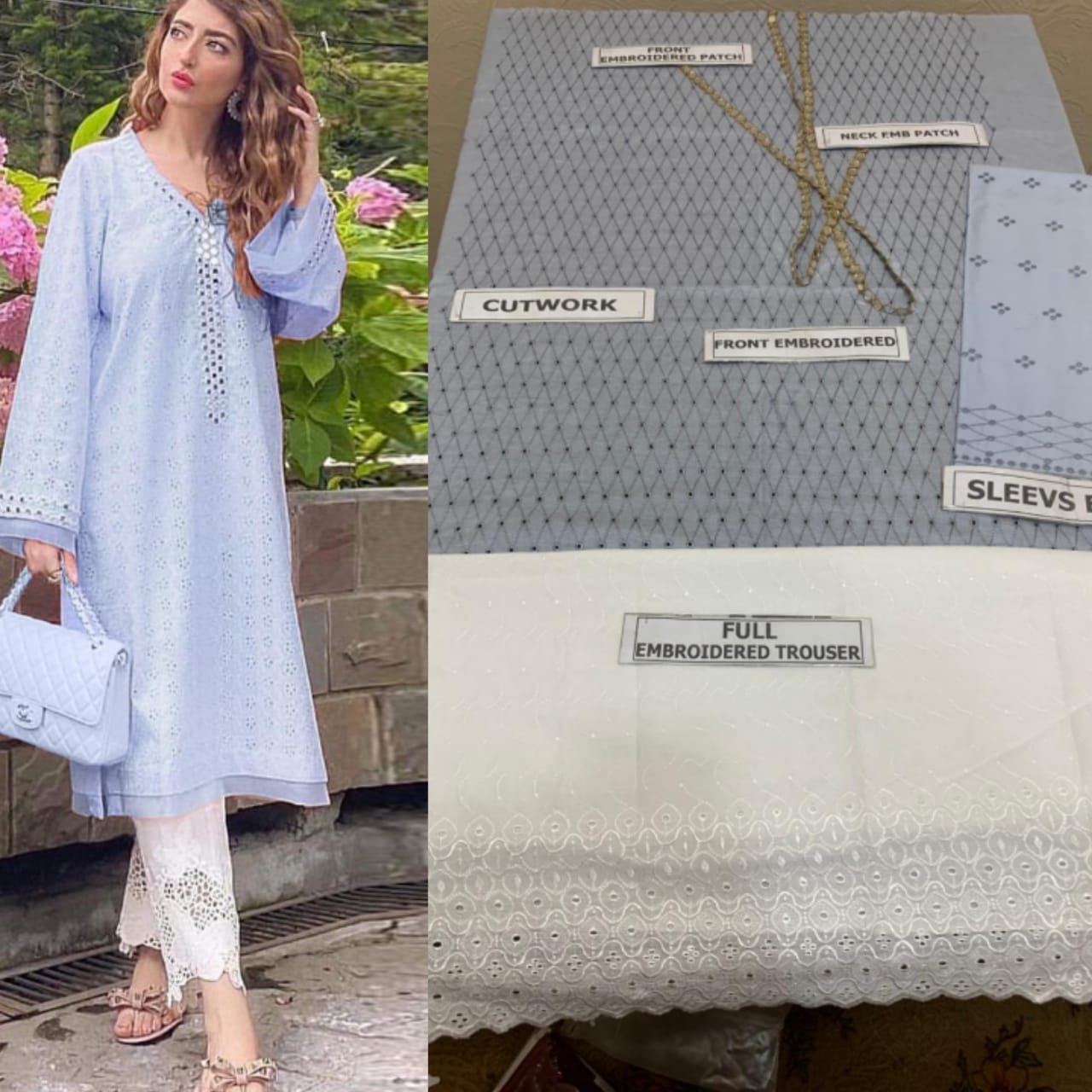 Elaf Blue fully embroided Cutwork shirt and trouser with patches and with bamber sheefon printed dupata