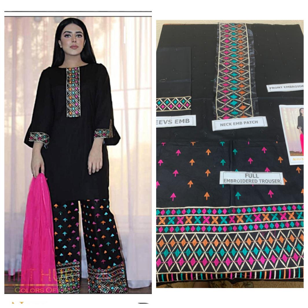 Kaseriya 2pc suit fully emb shirt with neck patch with plain trouser