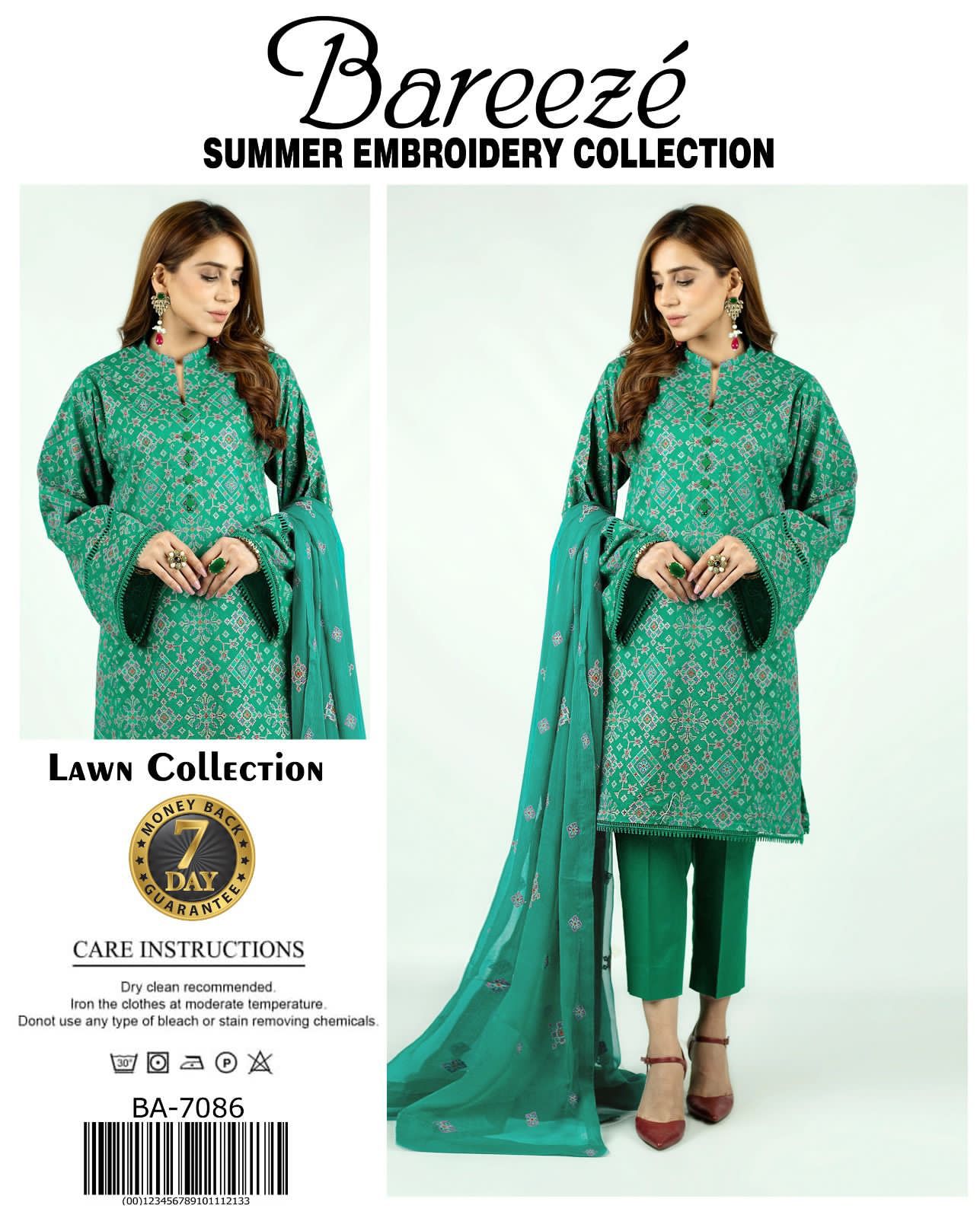 Bareeze Summer lawn collection arrival for eid 3pc lawn fully embroided shirt with plane trouser & with embrioded bamber chifoon dupata