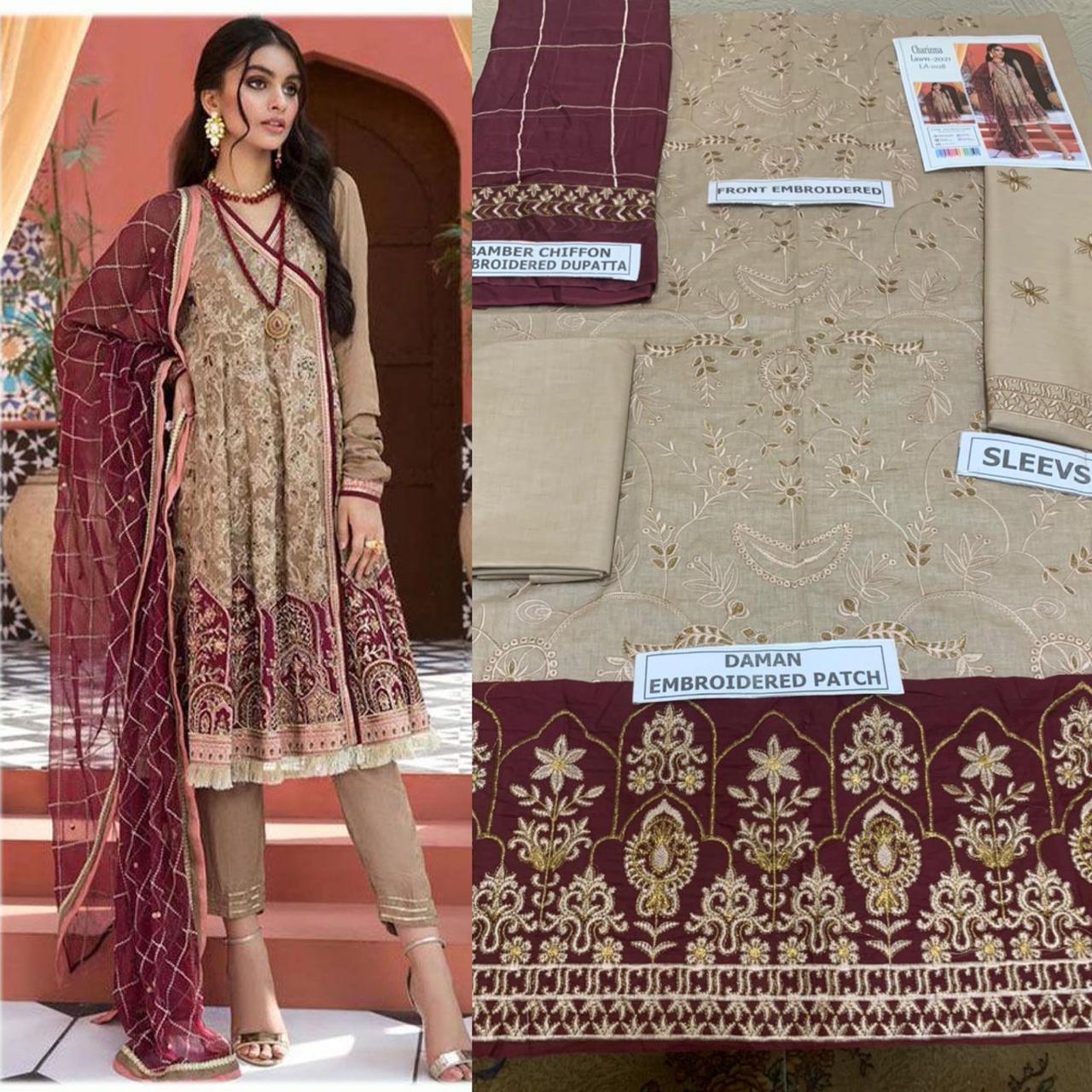 Charizma 3pc suit with bamber sheefon dupata fully embroided dress with patches