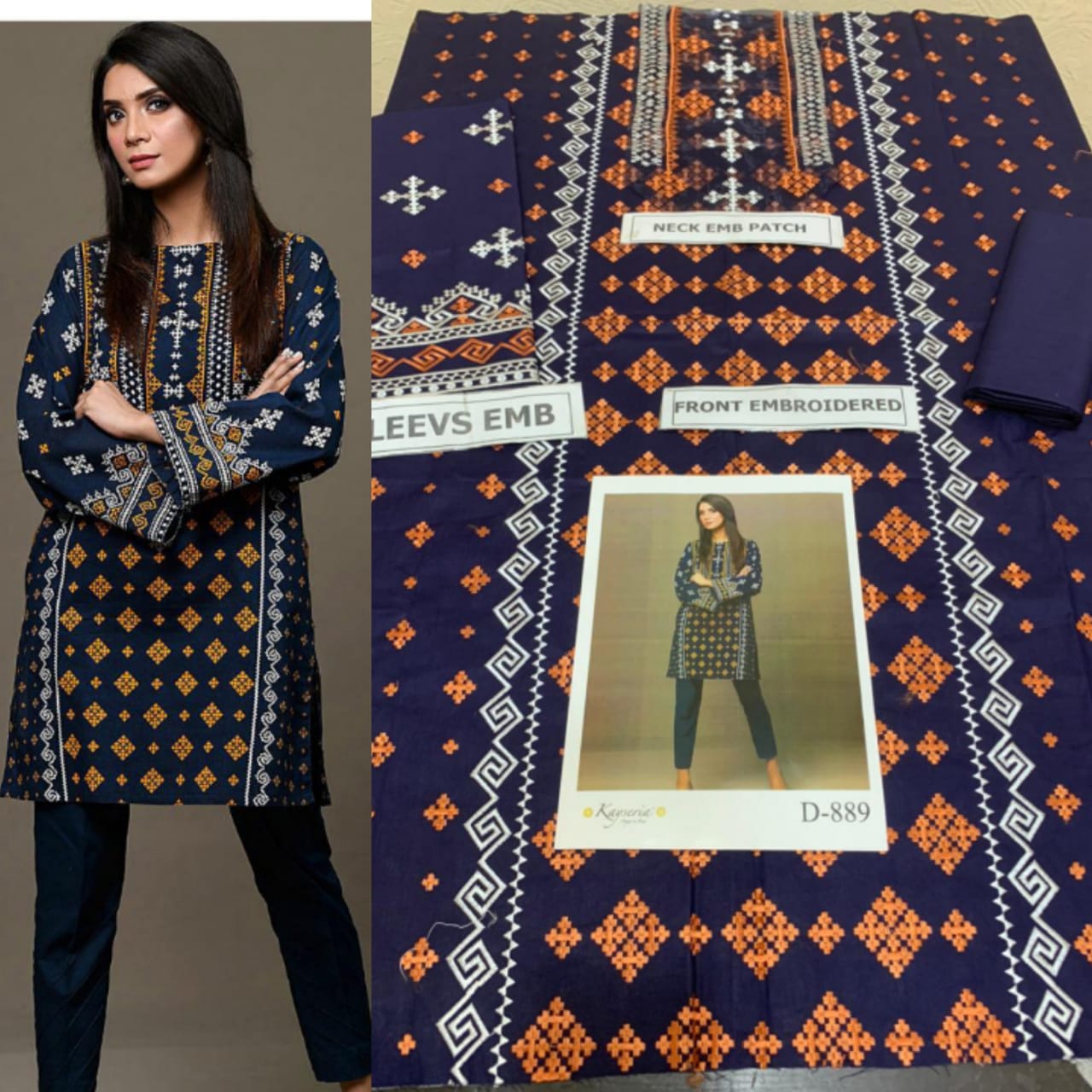 Kaseriya 2pc suit fully emb shirt with neck patch with plain trouser